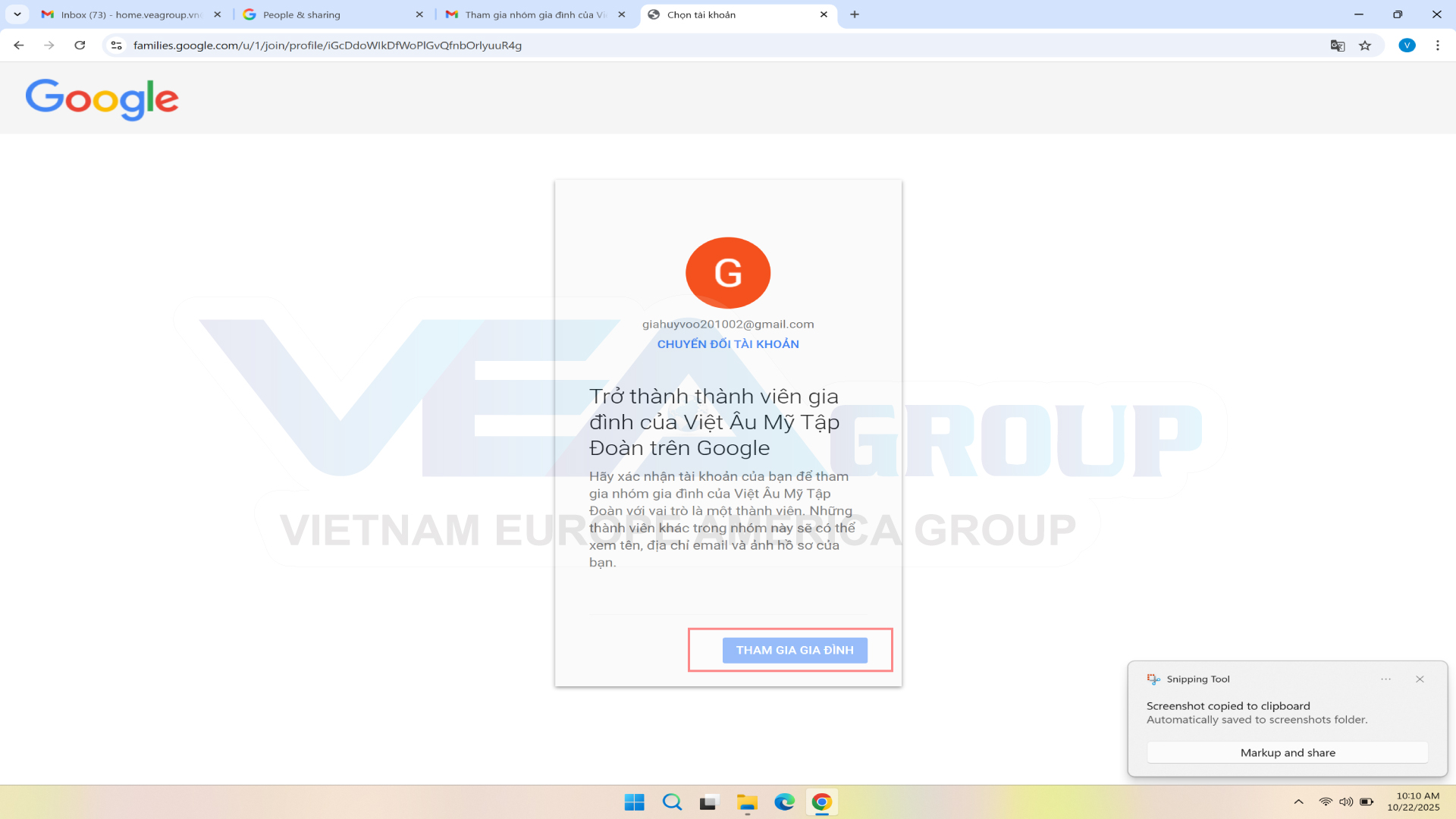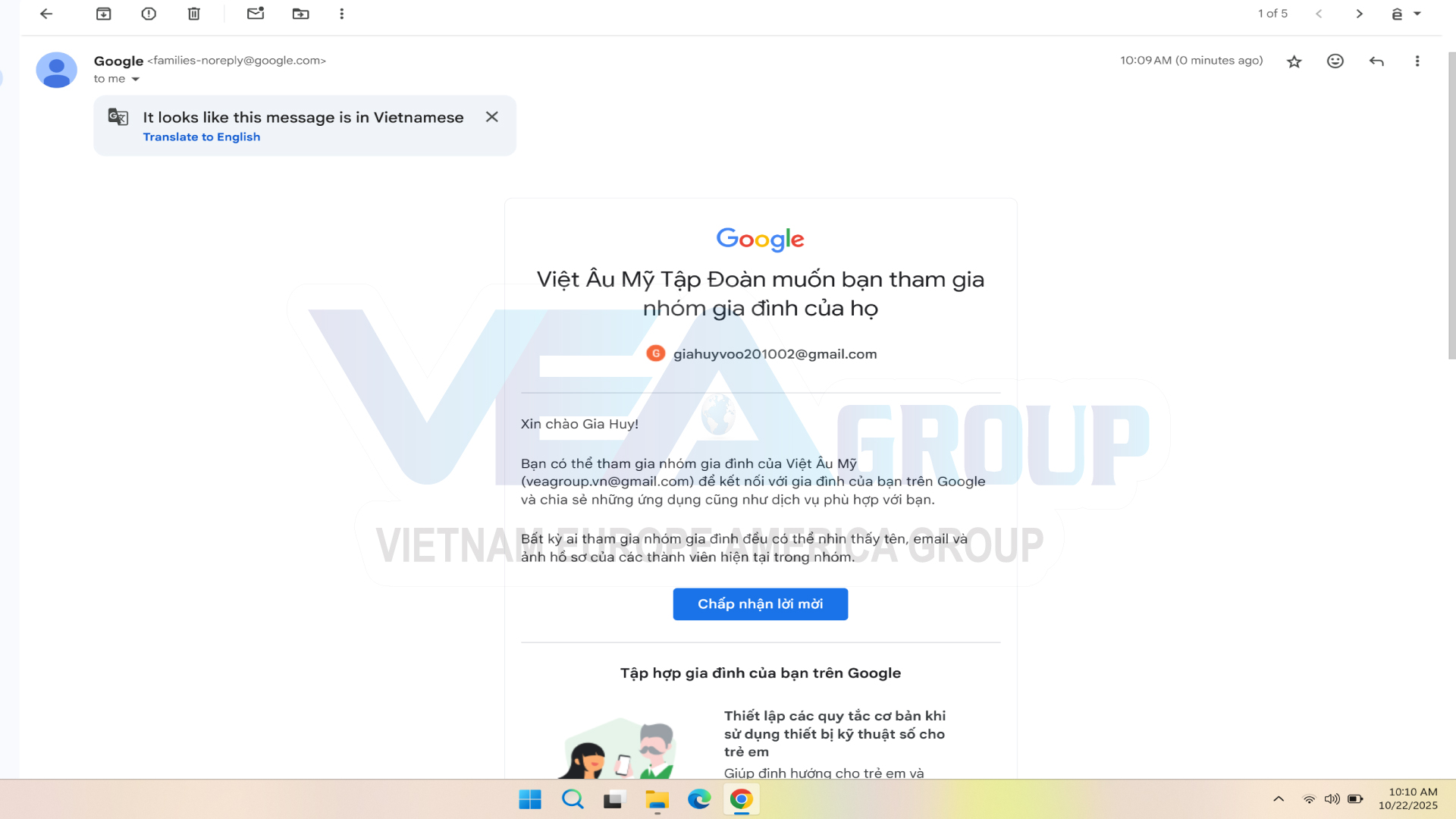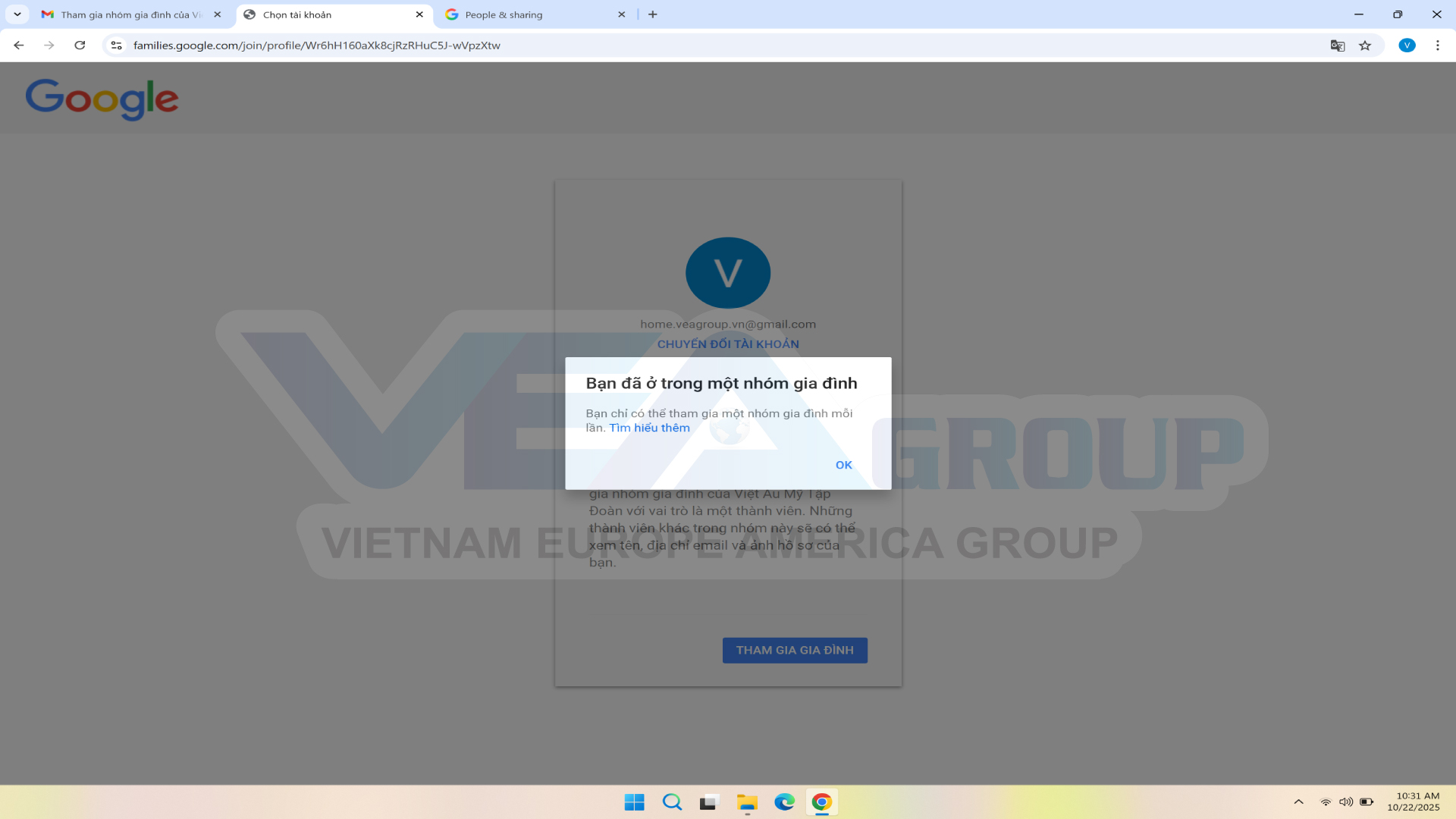 +) Tình huống 1: Email của bạn đang là thành viên trong nhóm gia đình khác.