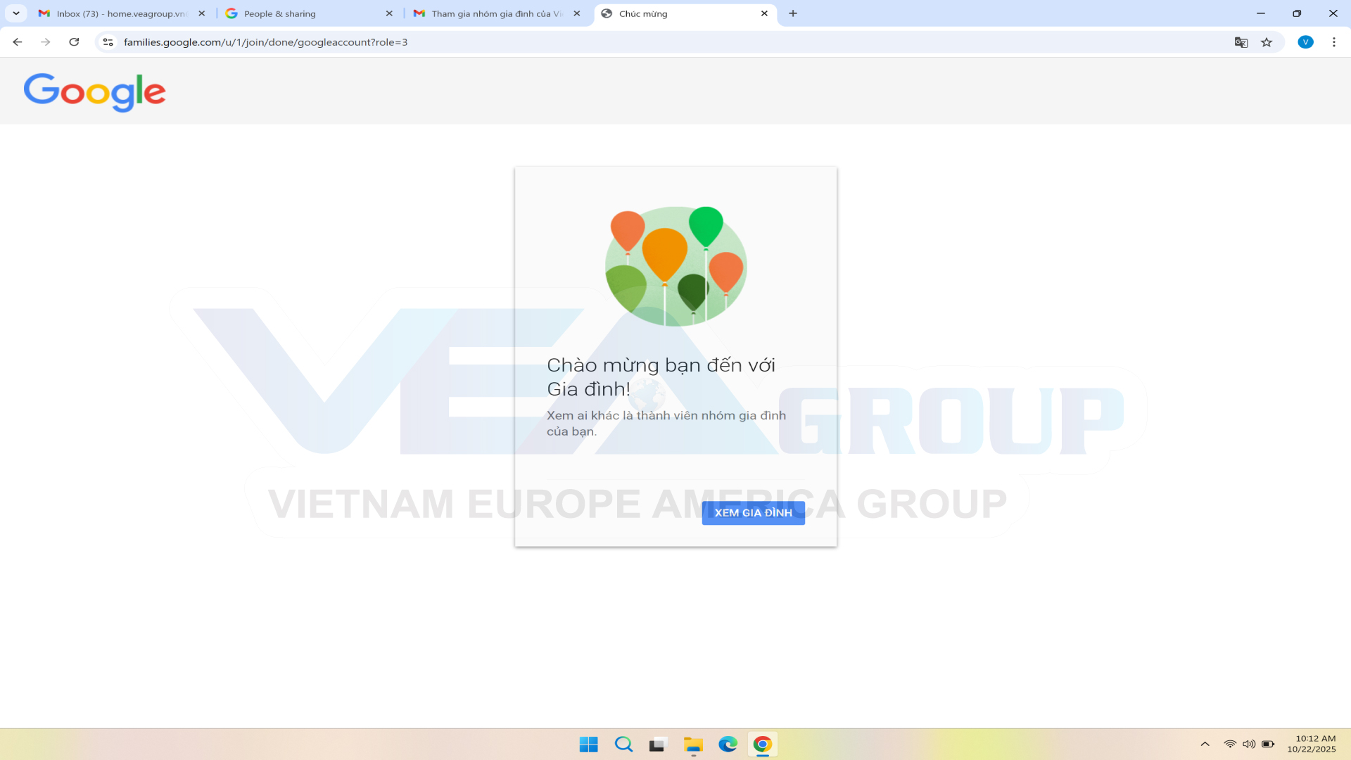 Sau bước 3, màn hình sẽ hiển thị thông báo CHÀO MỪNG BẠN ĐẾN VỚI GIA ĐÌNH – nghĩa là BẠN ĐÃ THAM GIA THÀNH CÔNG