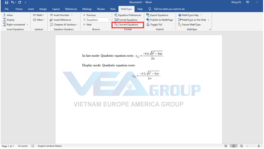 Bước 2: Trên thanh công cụ Word, vào tab MathType → chọn Convert Equations.