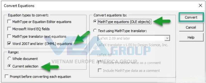 Bước 3: Trong hộp thoại Convert Equations, bạn tiến hành thiết lập như sau: