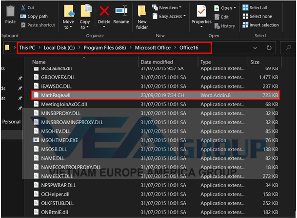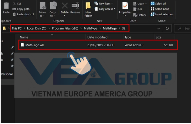 Bước 1: Để thêm Mathtype vào Word trước tiên hãy truy cập vào thư mục cài đặt Mathtype. Nếu bạn cài mặc định thì sẽ là (C) > Program Files (x86) > Mathtype > MathPage > 32 cho hệ điều hành 64bit, và sẽ là Program file cho hệ điều hành 32 bit. Chọn và coppy file MathPage.wll.