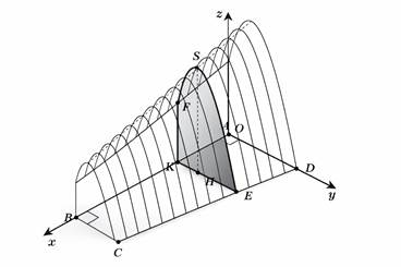 Câu 20: [VEAgroup] Một khu nhà kính sinh thái nông nghiệp công nghệ cao được thiết kế với mặt bằng đáy là một hình thang $ABCD{}$ vuông tại $A{}$ và $B{}$ với $AD\parallel BC$. Xét một thiết diện bất kì của nhà kính vuông góc với trục $AB{}$ tại điểm $K{}$. Thiết diện thu được là một hình phẳng giới hạn bởi vòm cong $\left( P \right)$, đoạn thẳng mặt nền $KE{}$ và đoạn tường thẳng đứng $KF{}$. Giả sử $\left( P \right)$ là một nhánh của parabol có đỉnh $S{}$, $H{}$ là hình chiếu vuông góc của $S{}$ lên mặt nền $KE{}$, $E{}$ là chân của vòm parabol. Để đảm bảo tính khí động học và phân bổ ánh sáng, các kỹ sư thiết kế vòm sao cho $SH=3EH$. Biết rằng một mặt bên của nhà kính là một bức tường phẳng vuông góc với đáy và tại mọi vị trí mặt cắt thì chiều cao của tường luôn bằng với bề rộng của nền nhà kính tại vị trí đó, nghĩa là $KF=KE$ và $F\in \left( P \right)$
