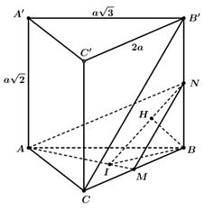 $BN=\dfrac{B{B}'}{2}=\dfrac{a\sqrt{2}}{2}$; $BH=\dfrac{BN.BI}{\sqrt{B{{N}^{2}}+B{{I}^{2}}}}=\dfrac{\dfrac{a\sqrt{2}}{2}.\dfrac{a\sqrt{3}}{2}}{\sqrt{{{\left( \dfrac{a\sqrt{2}}{2} \right)}^{2}}+{{\left( \dfrac{a\sqrt{3}}{2} \right)}^{2}}}}=\dfrac{a\sqrt{30}}{10}$.
